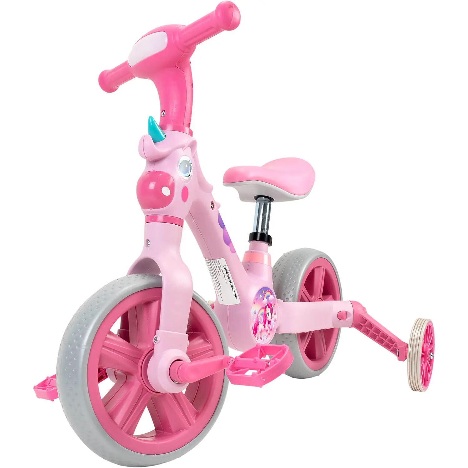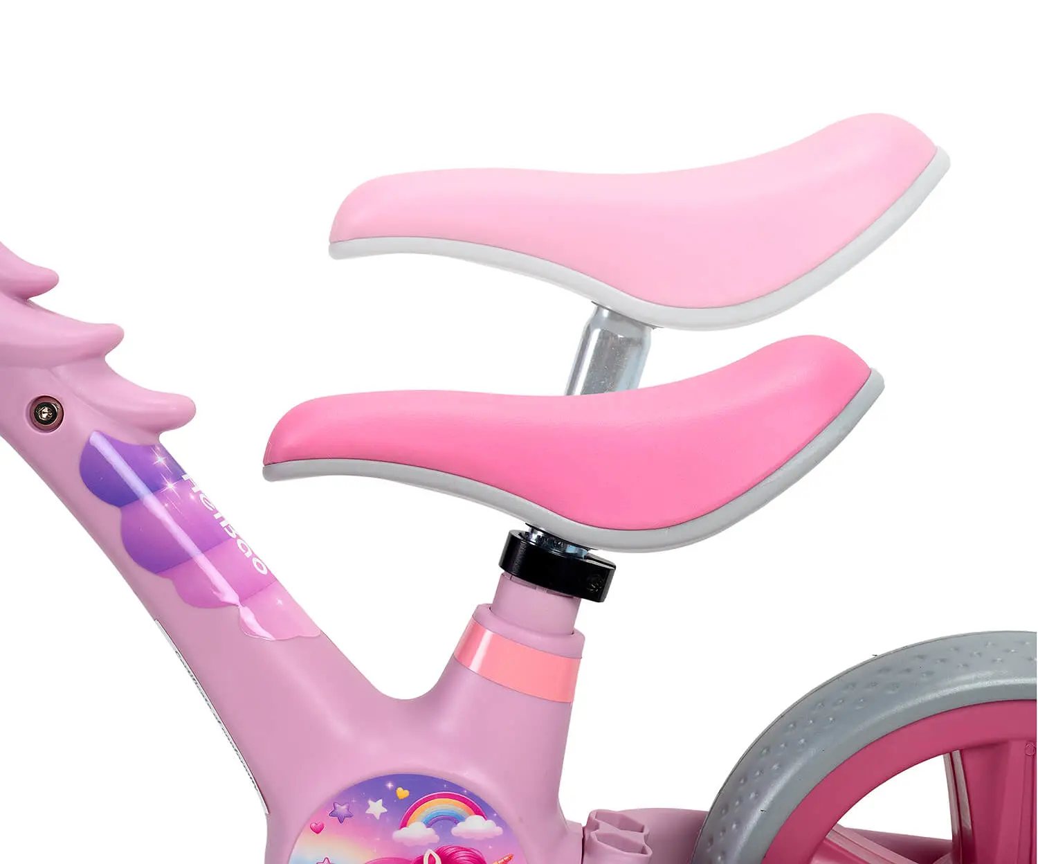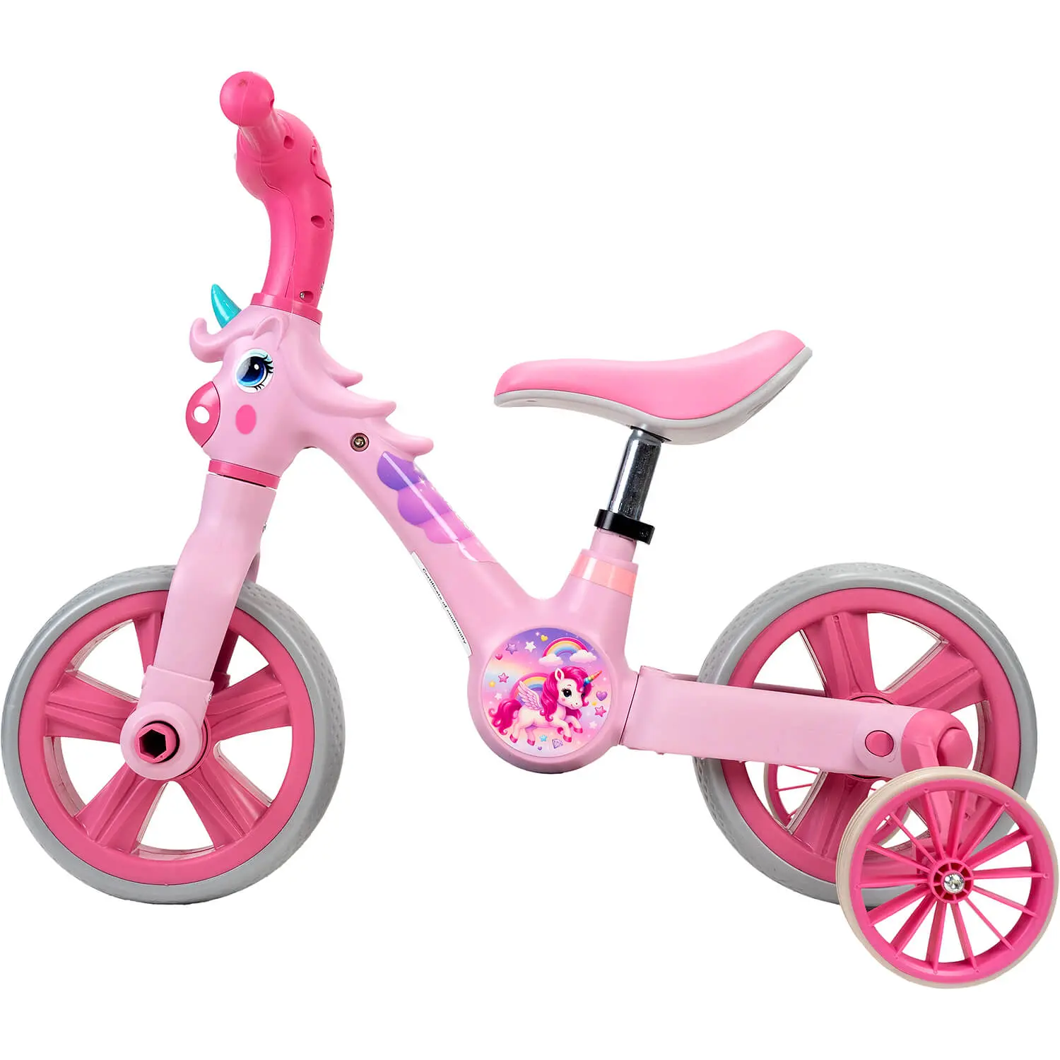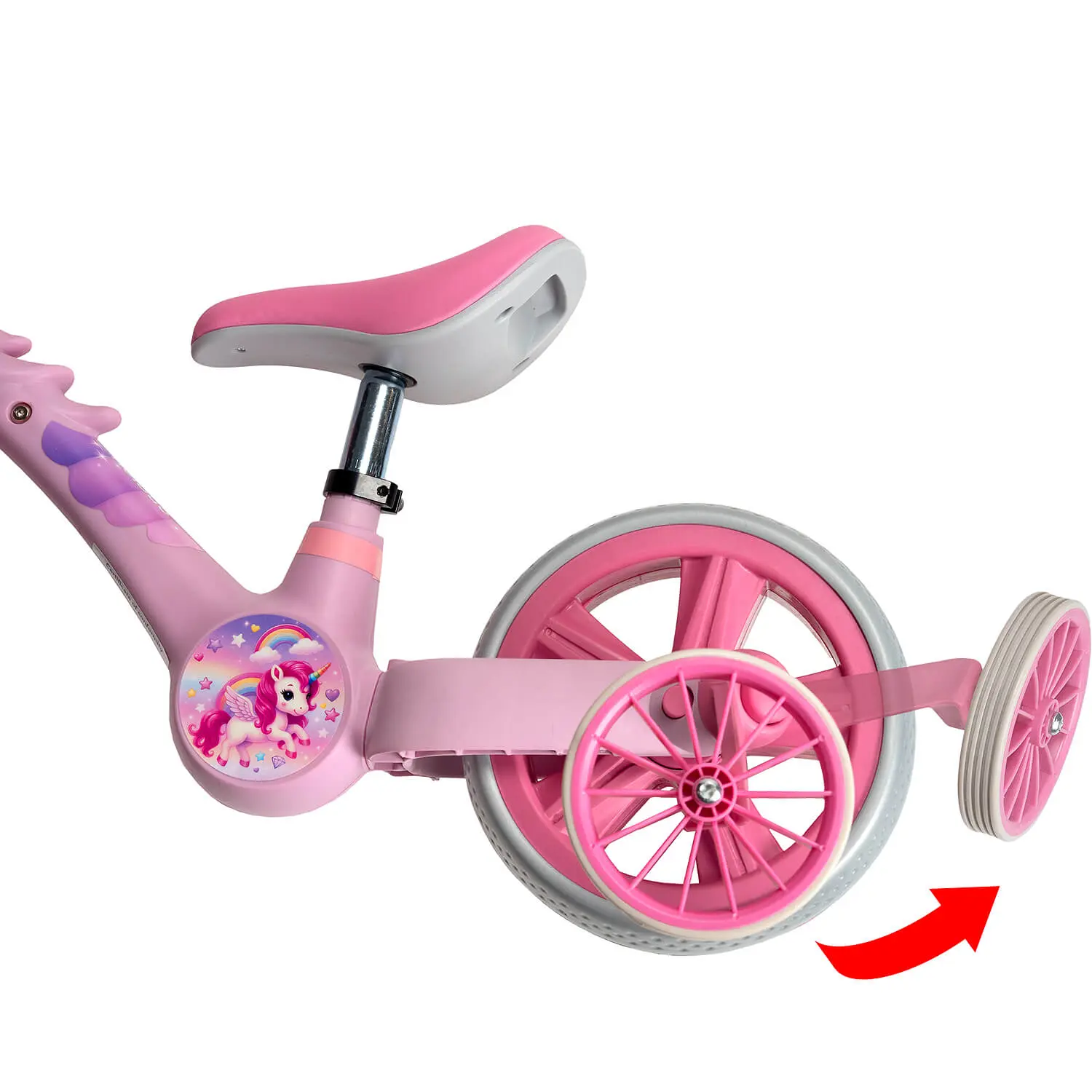 Datorita pedalelor detasabile, bicicleta poate fi folosita initial ca balance bike, ajutand copilul sa isi dezvolte echilibrul, coordonarea si increderea in mers. Ulterior, prin montarea pedalelor si a rotilor ajutatoare, se transforma rapid intr-o bicicleta stabila, potrivita pentru primele experiente de pedalat.