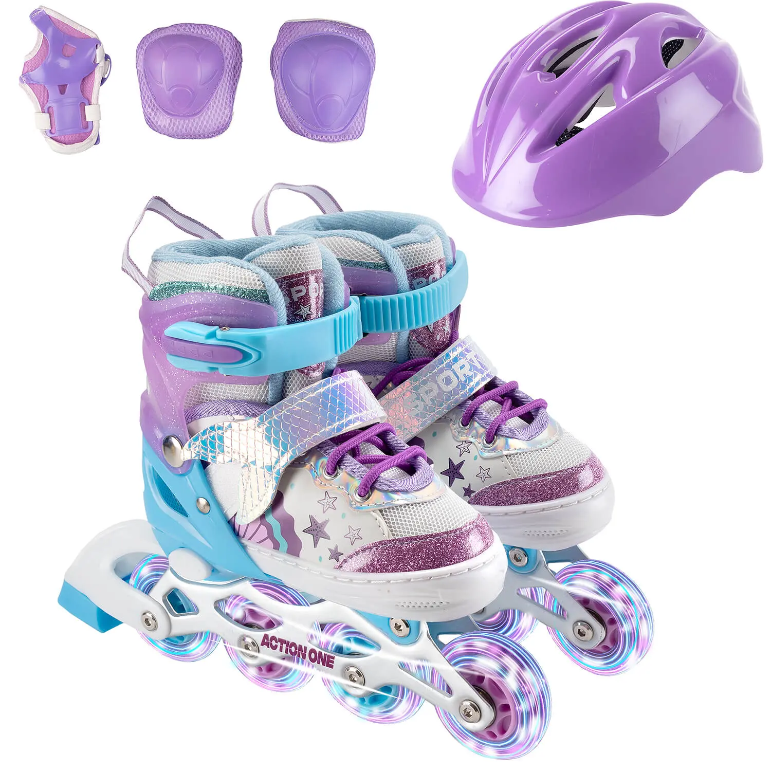 Kitul include: role reglabile, casca de protectie, protectii pentru coate si genunchi, toate intr-un ghiozdanel de transport. Rolele sunt reglabile pe mai multe marimi, au gheata foarte rezistenta si captuseala moale si confortabila. Se fixeaza corect si ferm pe glezna, asigurand protectie optima piciorului.