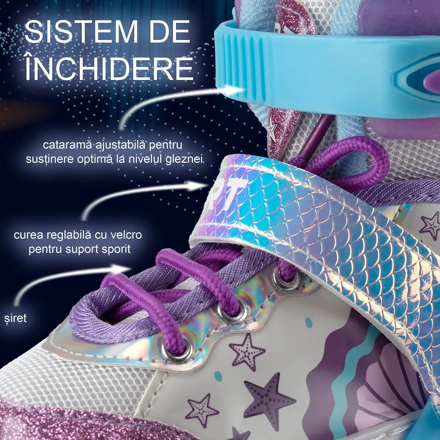 Sistem de inchidere: catarama ajustabila pentru sustinere optima la nivelul gleznei, siret si velcro pentru suport optim