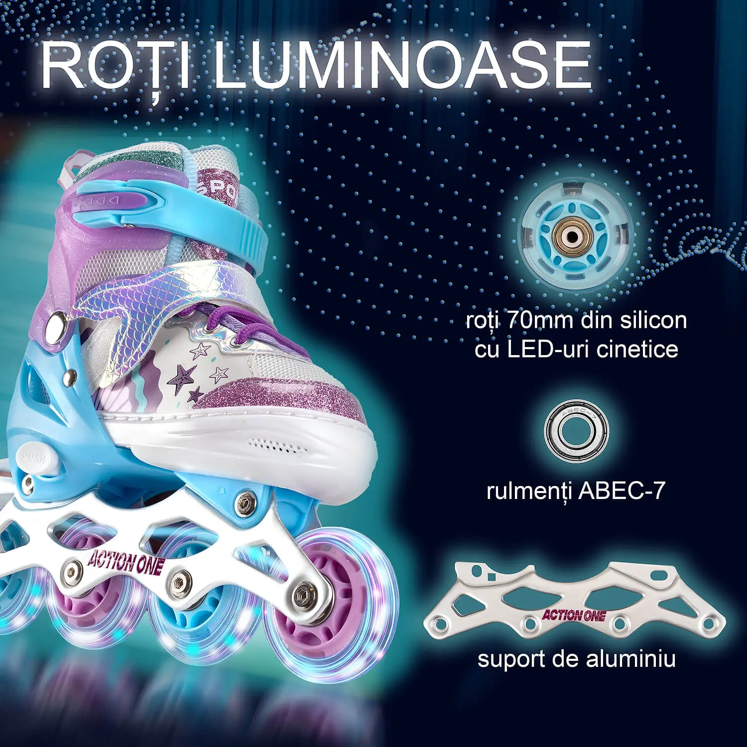 Rotile au un diametru de 64 mm si sunt dotate cu LED-uri cinetice, care se aprind in timpul mersului – un efect spectaculos ce adauga magie fiecarei plimbari.