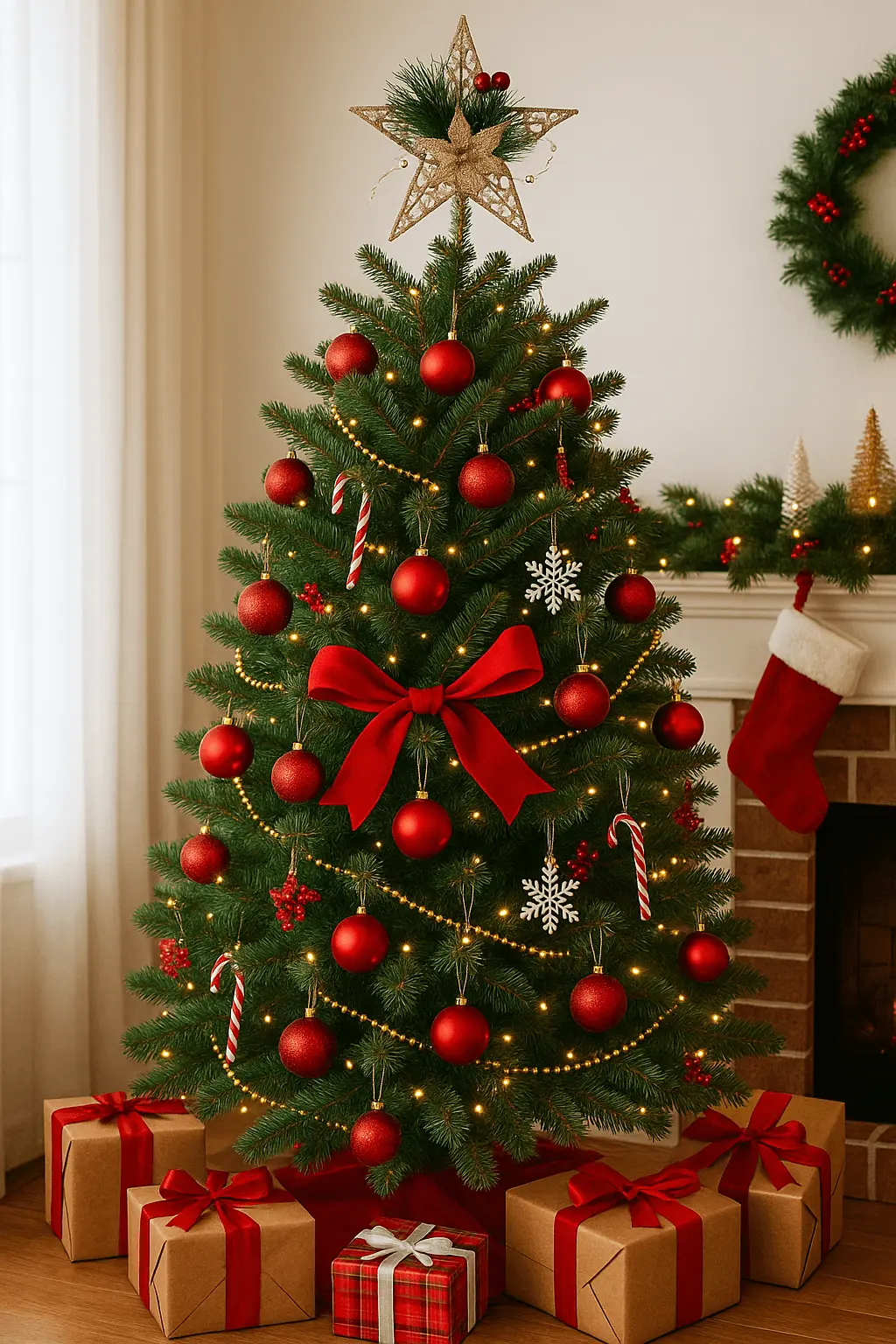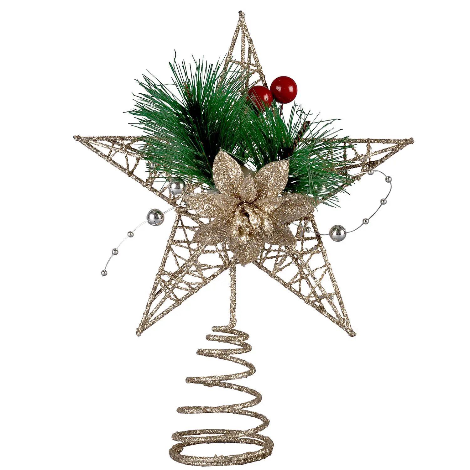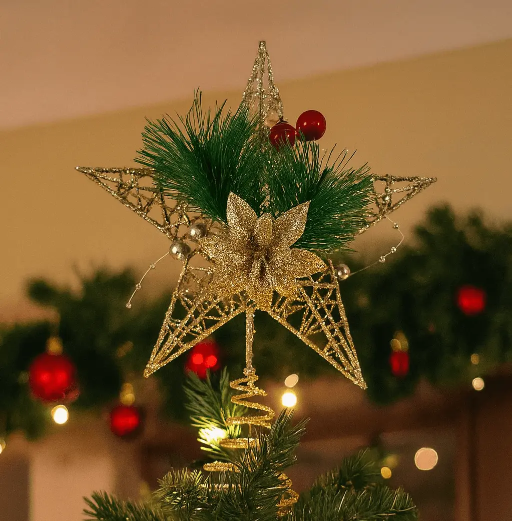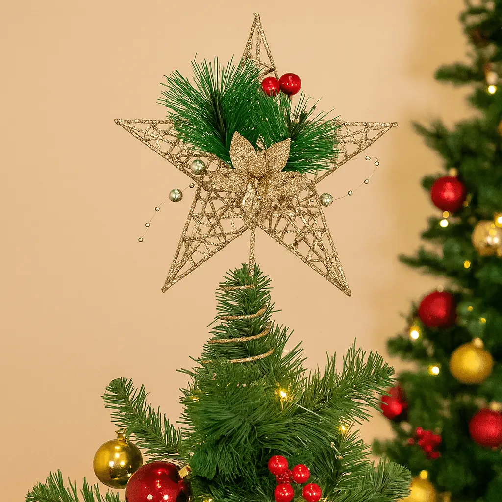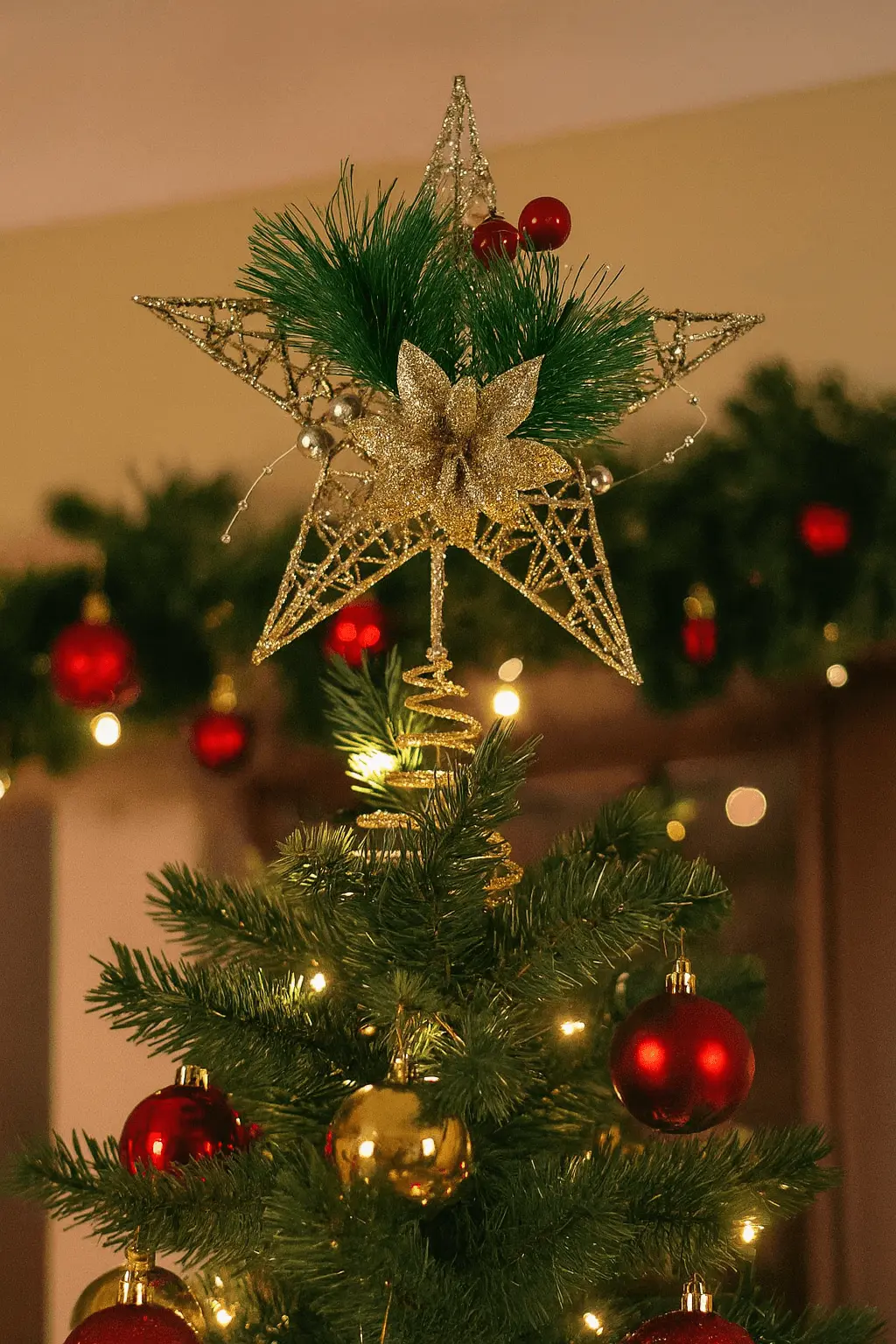 Varf de brad auriu in forma de stea, decorat cu ramuri verzi, fructe rosii si floare stralucitoare.
